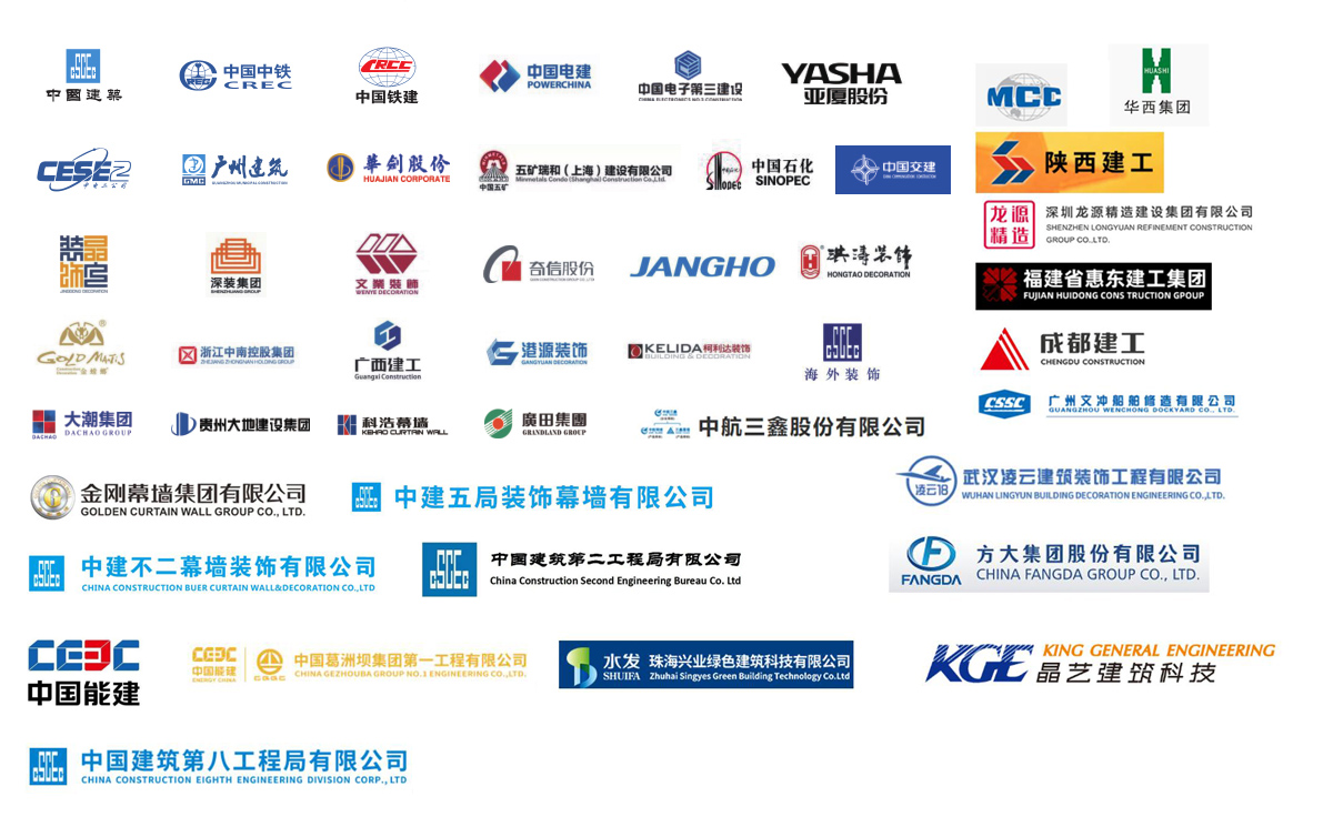公司參建了諸多大型項(xiàng)目工程,如港珠澳大橋、珠海國(guó)際航展、深圳國(guó)際會(huì)展中心、廣州白云機(jī)場(chǎng)、西安全運(yùn)會(huì)場(chǎng)館、成都東安湖大運(yùn)會(huì)場(chǎng)館、樂(lè)山奧體中心、洛陽(yáng)奧體中心、增城富士康廠房、惠州中海油、陽(yáng)江核電站、珠三角各地鐵線、高鐵站、廣西桂林機(jī)場(chǎng)、廣西柳州文化廣場(chǎng)、四川成都天府機(jī)場(chǎng)、海南??诿捞m機(jī)場(chǎng)、西安絲路會(huì)展中心、惠州北站等等。與中國(guó)建筑、中國(guó)中鐵、中國(guó)鐵建、中國(guó)電建、中國(guó)交建、中國(guó)中冶、中國(guó)能建、廣東建筑、廣西建工、廣州建筑等大型國(guó)有企業(yè)下屬公司及江河幕墻、金螳螂裝飾等各大建筑裝飾、幕墻裝飾公司達(dá)成長(zhǎng)期友好合作關(guān)系。